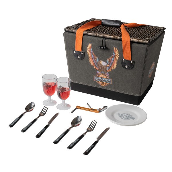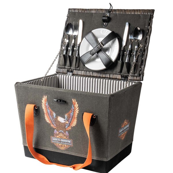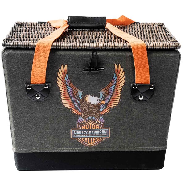 Classic picnic basket with wicker lid features Vivid Bar & Shield Eagle graphics and handles for easy transport.